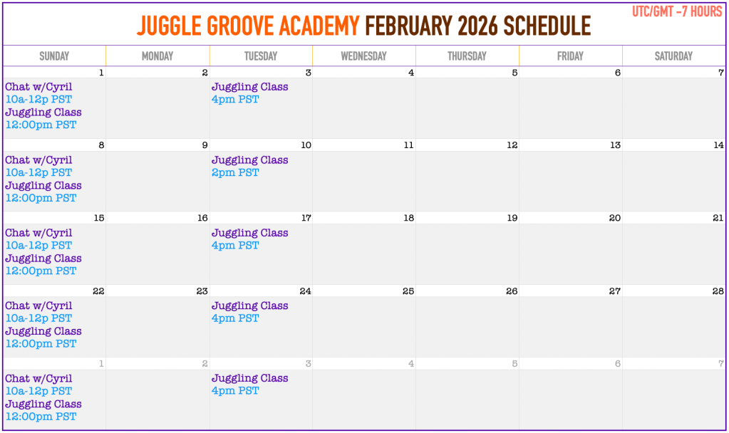 Juggle Groove Academy is a small and intimate online juggling school (there are currently 11 active students). Our weekly classes happen face-to-face on Zoom, always live with your teacher, Cyril Rabbath. Depending on your goals and personality, juggling can be either athletic, artistic, scientific, or spiritual. My objective is to teach you a healthy juggling foundation and advanced techniques by focusing on body awareness, flow efficiency, and overall well-being.