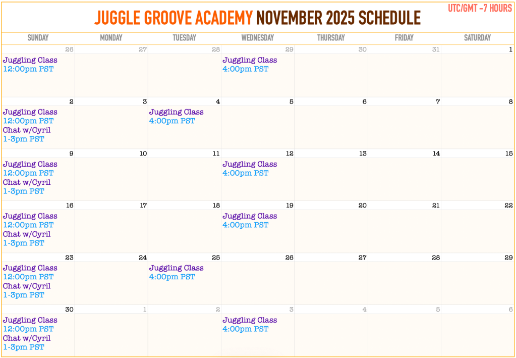 Juggle Groove Academy is a small and intimate online juggling school (there are currently 14 active students). Our weekly classes happen face-to-face on Zoom, always live with your teacher, Cyril Rabbath. Juggling can be either athletic, artistic, scientific, or spiritual, depending on your goals and personality. My objective is to teach you a healthy juggling foundation and advanced techniques by focusing on body awareness, flow efficiency, and overall well-being.