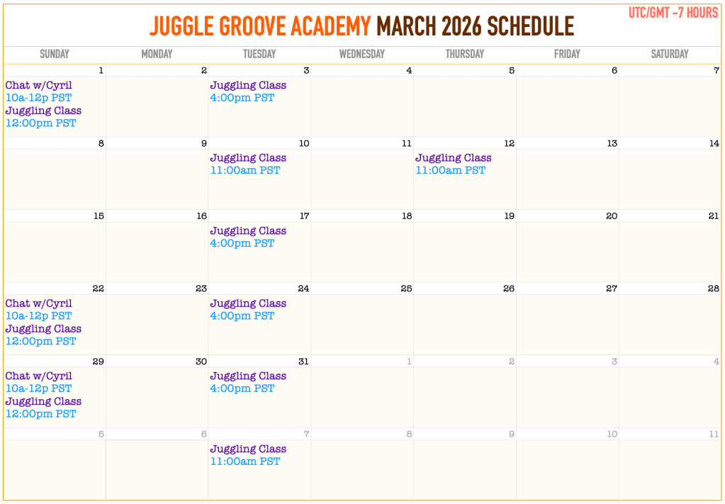 Juggle Groove Academy is a small and intimate online juggling school (there are currently 11 active students). Our weekly classes happen face-to-face on Zoom, always live with your teacher, Cyril Rabbath. Depending on your goals and personality, juggling can be either athletic, artistic, scientific, or spiritual. My objective is to teach you a healthy juggling foundation and advanced techniques by focusing on body awareness, flow efficiency, and overall well-being.